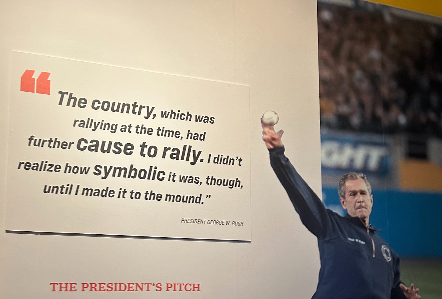 Bush is presented, above all, as a guy who loved sports. There is a comically large exhibit dedicated to the time he threw out the first pitch at Yankee Stadium after 9/11. (He threw a perfect strike, the exhibit notes.) There are many glass cases with baseball memorabilia, including one wall-sized case holding all of the signed baseballs Bush accumulated as president. “It’s no secret my husband loves baseball,” explained a mounted quote from Laura Bush. Well, sure.