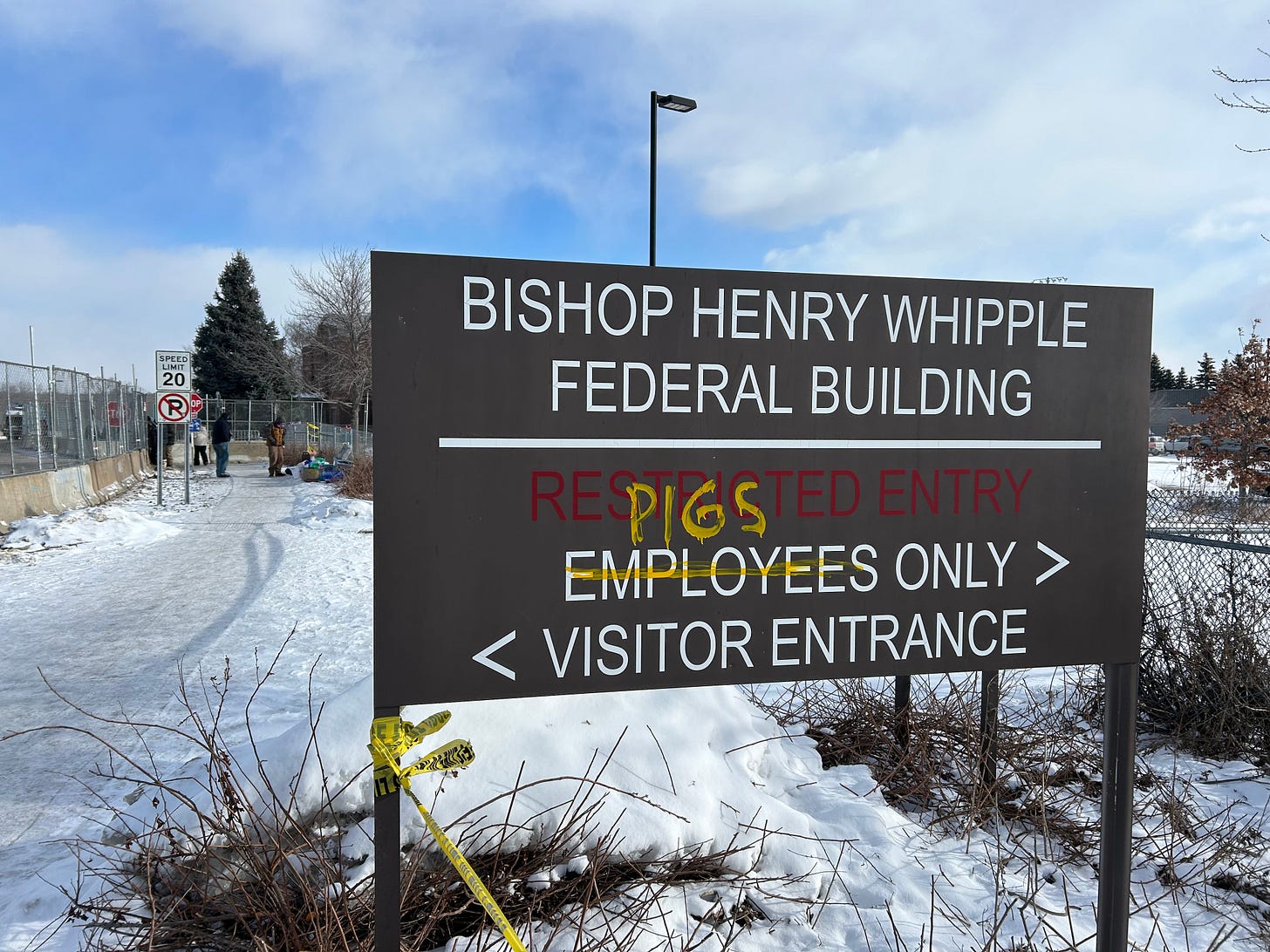 The Bishop Henry Whipple Federal Building is a squat, bunker-like seven story concrete box out by the Minneapolis airport. It is the headquarters of the ICE and CBP invasion of the city, and is now both the real heart of the deportation machine here, and the greatest symbolic target of resistance to it. People go to Whipple every day to protest. The road leading into Whipple is now lined with concrete barriers topped with chain link fences. Protesters are confined to the opposite side of the street. Hennepin County Sheriff’s vehicles sit out there constantly to make sure that nobody gets on the wrong side of the barriers. Nevertheless, some enterprising individuals have managed to spray paint “FUCK ICE” and “RIP RENEE GOOD” along the street side of the concrete slabs. On the “EMPLOYEES ONLY” sign at the building’s parking lot, someone has crossed out “EMPLOYEES” and written “PIGS.”