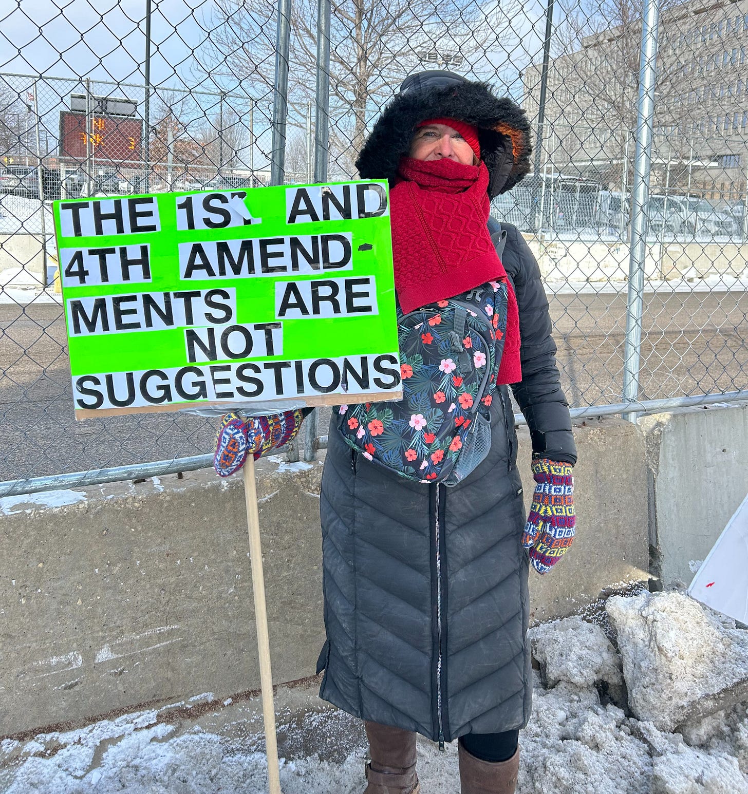 Pressed against the chain link fence in a long hooded coat was a grandmother named Cindy. She had made a sign on bright green posterboard that read “The 1st and 4th Amendment Are Not Suggestions.” The sign was attached to a long stick and she slid it through a gap in the fence so that it reached out into the road when the agents drove by. She lives in Wisconsin. She had been driving into Minneapolis to stand in that spot every day for a week. “I do watch my grandson in the city,” she said, “but even if I wasn’t watching him, I would still come.”