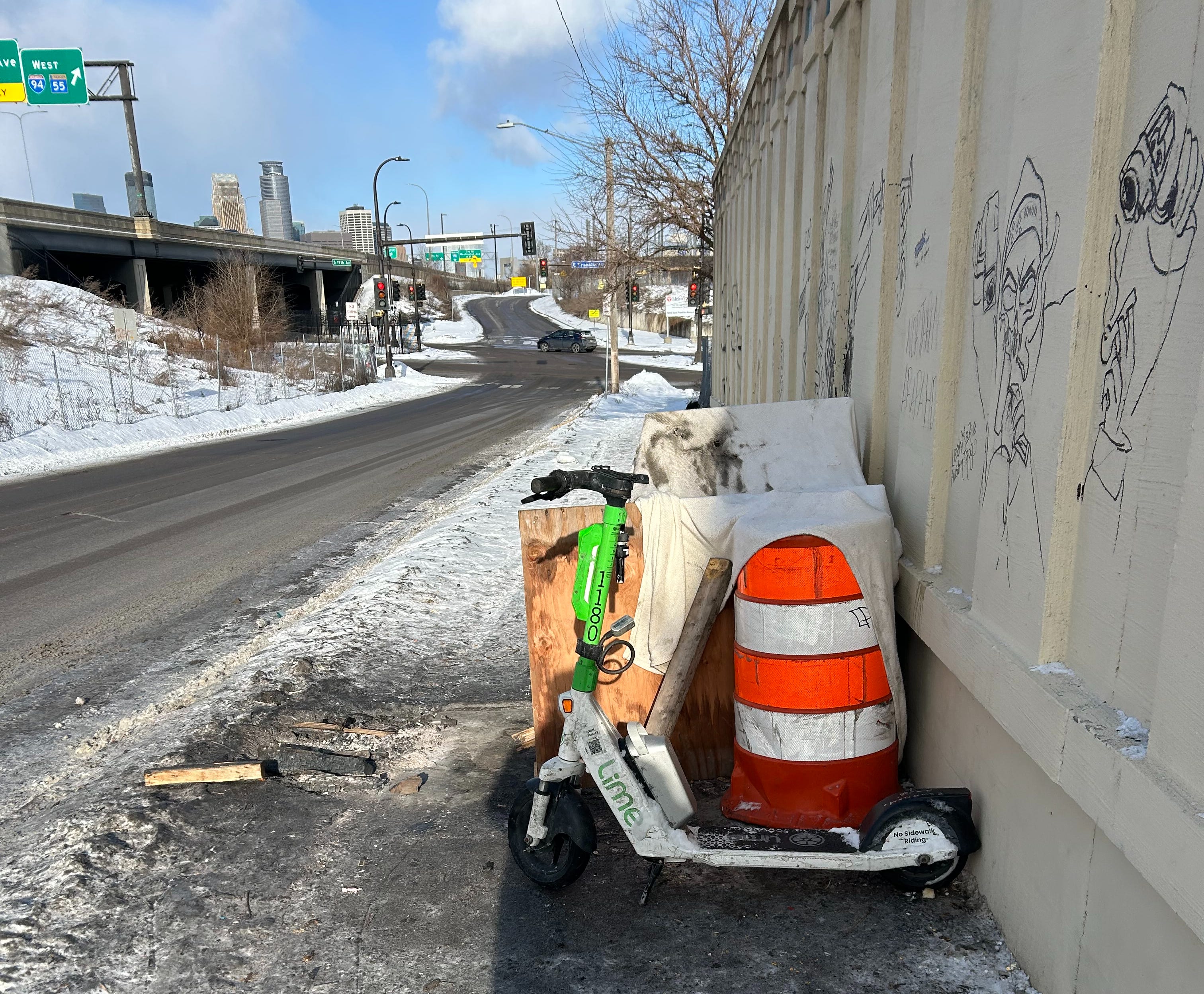 Halfway up the hill was a tiny enclosure made of two pieces of plywood with a dirty blanket on top and some purloined couch cushions on the ground. Inside was someone living their own struggle. They had built a fire on the sidewalk and there were several logs still smoldering. I kicked the logs to the side and gingerly maneuvered the wheelchair through the ashes. “I’ve been trying to get an electric wheelchair,” Connie said, as if to apologize.
