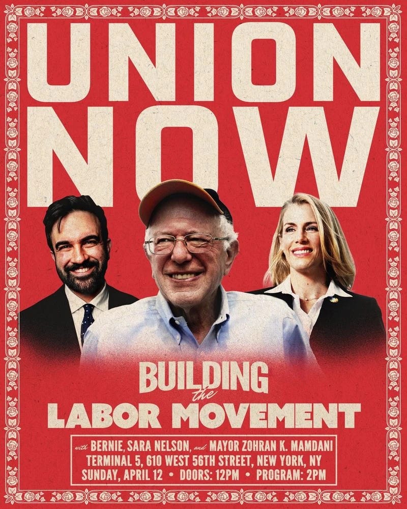 I cannot count the number of times that people have asked me over the years: “If I want to help unions, where should I donate?” In response to this, I have always rattled off a list of independent unions and organizing nonprofits and political groups and publications. I have given and will continue to give money to all of those groups myself. But now, I will have an easier answer: You can give to Union Now. They will take the money and use it to support major, strategic union organizing campaigns that will move the needle. They will take the money and use it to support workers on strike, to help them stay out long enough to win. These are direct, targeted ways to build union power, period. This is the sort of credible pipeline of money directly into critical union fights that I have long wanted to see. The fact that people like Bernie and Zohran and Sara Nelson and many other union leaders and union members are taking the time to do this rally speaks for itself. The changes that progressives want to see in America will never become a reality unless we can rebuild the power of the working class. That means organizing more unions and giving them what they need to win hard fights. That’s what this is all about.